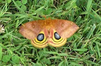 Strangely enough it was about three years ago that I saw the adult of this strange moth at our farm in Galax, VA. The unusually colored adult moth appeared on a window screen one morning where it must have been drawn to the lights the night before (see photos). With the wings closed the moth is cryptic in the right background and would presumably escape detection by most predatory birds. If it is detected and is poked, it opens its wings and reveals a marvelous set of false eye spots (see photo). Many moths have eye spots on their hind-wings that mimic an owl's face or just provide something scary for a bird to think about. But the Io moth has what I consider the most impressive set of eye spots. But even so I am amused that a bird would find this intimidating.