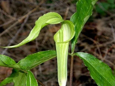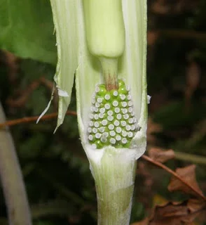 The pulpit or spathe surrounds the spadix (Jack and/or Jill - let us not be male chauvinists!) which holds the flowers. They are fertilized by flies attracted to the odor and heat of the flowers. Remember that their cousin skunk cabbage (also an arum) has a similar means of attracting pollinators. Young plants tend to have all male flowers; there are more female flowers as they age. Indeed some studies have shown that the predominant sex of the flowers is determined by the condition of the plant. If it has been a good year and the plant is healthy and has a good supply of nutrients in its bulb, it becomes female. In a bad year it produces male flowers. Why do you suppose this could be a good strategy for reproduction? Consider that it is "cheaper" to be a male and produce a lot of pollen to fertilize other plants. Producing fruits with seeds is a lot more expensive in terms of energy and a poor year could result in very few prospects for reproduction in female mode.