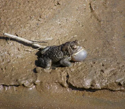 On closer inspection (see photo 2) it is clear that these were a huge mass of black tadpoles, apparently in their death throes as the pond dried. I immediately concluded they must be American toad tadpoles due to their color, choice of habitat, and time of year. Male American toads (see photo 3) start calling in early Spring when it rains and search out very small isolated ponds that lack fish and most other aquatic critters of any size. Their call is a series of long trills and it attracts females for mating. Long strings of eggs are laid and quickly hatch. Under ideal conditions the larvae grow rapidly and many will metamorphose at a very tiny size and leave the pond before it dries. However if enough rain does not fall to maintain the pond, all or most of the tadpoles may die, as seems to be the likely scenario here.