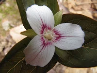 The excitement of our finds escalated with a "SCREAM!" at the discovery of a plant that one participant had been wanting to see. It was a rather inconspicuous plant amongst it's similar looking relatives, the Solomon's Seal, and Yellow Mandarin's . There were the delicate pink bells hanging beneath alternate leaves of the Rosy Twisted Stalk. The scream came, then the drop down to get a quick close look, resulted in getting stuck amongst rocks in an awkward position that she needed help out of ! Three of us sat a while to take it in.