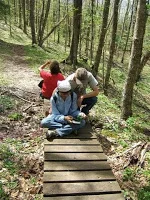 of Dutchman's Breeches, the very tail end of Squirrel Corn and Trout Lily's. Purple and Painted Trillium were abundant and delicate, along with Jack in the Pulpits, the smallest I've seen. This is a beautiful meandering trail through a deciduous forest, rhododendron thickets, large rock outcroppings, and a swift moving stream that the trail crossed twice with bridges. The upper reaches of the trail were moist where we found the largest abundance of plants.
