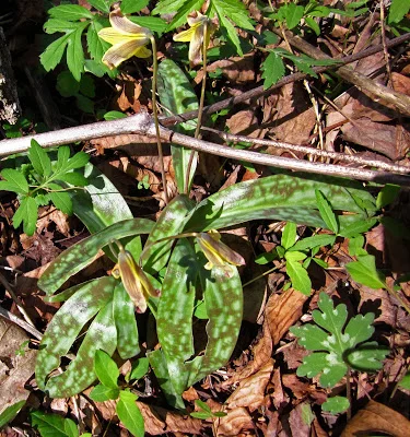 Two bright yellow blooms that one of the hikers scrambled down the hillside to photograph gave us the opportunity to discuss the plant's two common names, dogtooth violet and trout lily. We flipped through one of our wildflower books to discover that this speckled-leaf species, Erythronium americanum, a member of the Lily family, blooms near the beginning of trout season in many states. Consequently, trout lily is an apt name.
