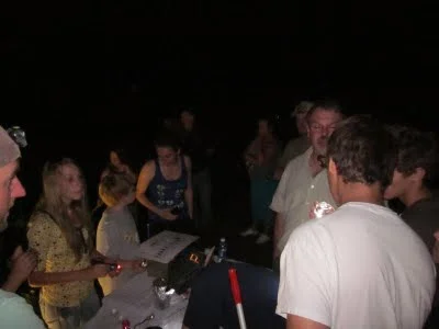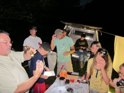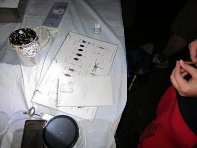 As planned, young people from all three participating groups gathered at 8:30PM near the confluence of Wilson Creek and the New River for a look at the adult forms of our aquatic invertebrate study subjects.Aaron Floyd and Scott Jackson-Ricketts prepared stretched sheets and lights for attracting the hatch, with special guest helper Justine Jackson-Ricketts.Inspection tables were set up with viewing boxes, Petri dishes, tweezers, flashlights, and drawing tools.Keying out the many insects flying around our faces took up most of the 2 ½ hours of our survey.