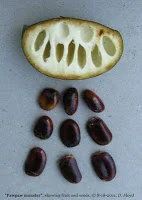 The fruits of the Pawpaw have custardy pulp, and 10-14 tough seeds that look like big brown beans. Some liken their flavor to banana or pineapple, though the ones I have eaten taste like a very mild soft mango. Around Central Virginia, the fruits ripen in mid to late August.