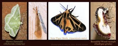 , more than 20 people gathered at the Matthews Living History Farm Museum from 8:30 to 11:30 p.m. to look at moths and other night-flying insects attracted to black light/moth sheet setups. Bob Perkins and Cecelia Mathis photographed insects for later identification. Bob subsequently identified 24 moth species and some other insects. He is working on three moths that may or may not be identifiable. Highlights included a dobsonfly, a long-horned caddisfly, beautiful wood-nymph, showy emerald, and nais tiger moth.