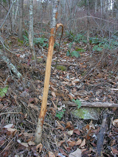 At the north end of the land, we leave the creek and assume our slow ascent. 25 years ago we had a road cut down to the creek for a variety of reasons. It is mostly grown over now, but noting a recently downed shag bark hickory, a very large tree, I began plotting a clearing party to gain access to this bounty. The rise from this point is quite a steep grade, and it is easy to spot deer trails due to the turned earth. Near one of these trails were several rubbed saplings, sign of bucks scenting their territory. Just below this sapling, was a significant scrape in the ground, another sign of territorial declaration.