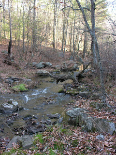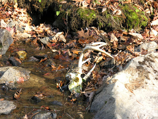 Our segment of Bridle Creek flows over some large rocks, creating a series of pools and washes, small waterfalls and the music of water we all appreciate. Along what passes for a trail beside the creek, we always find changes...newly fallen trees whose root systems were compromised by the latest flood...fluctuations in spring fed seeps...and the shifting of deer paths based upon these vicissitudes. And speaking of deer, here is one that won't be eating our garden greens next spring.