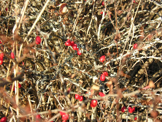I have never yet found a hummingbird's nest, though I have put some decent effort into it. Lichens plays a role in camouflaging the exterior of their tiny nests. And when you know that they are hardly any bigger round than a quarter, the challenge becomes apparent. With leaves gone I look harder, and especially in shrubs and trees covered with lichens, thinking that a hummer might prefer the extra protection provided by such cryptic surroundings.