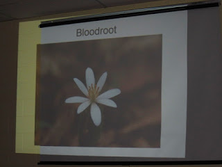 Cecelia Mathis, lover of the outdoors and wildlife photographer, presented her photos of wildflowers, birds and a butterfly today at the Grayson County Library, Independence, VA. Each photo was accompanied by a story which added to the description of the subject, sometimes where it was found, and always with a background of her personal discovery process. The chosen slides represented, for the most part, what we would expect to find at this time of year. Trout lily, spring beauty, a pair of purple finches, and trilliums graced the screen.
