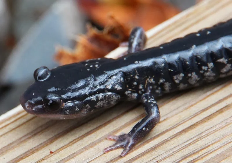 Slimy salamanders (Plethodon) are lungless and do not have an aquatic larval stage. They live under logs and wander leaf litter in wooded areas, feeding on insects and other small invertebrates. Their skin is covered with a gummy substance that is difficult to wash off if you get it on your fingers.