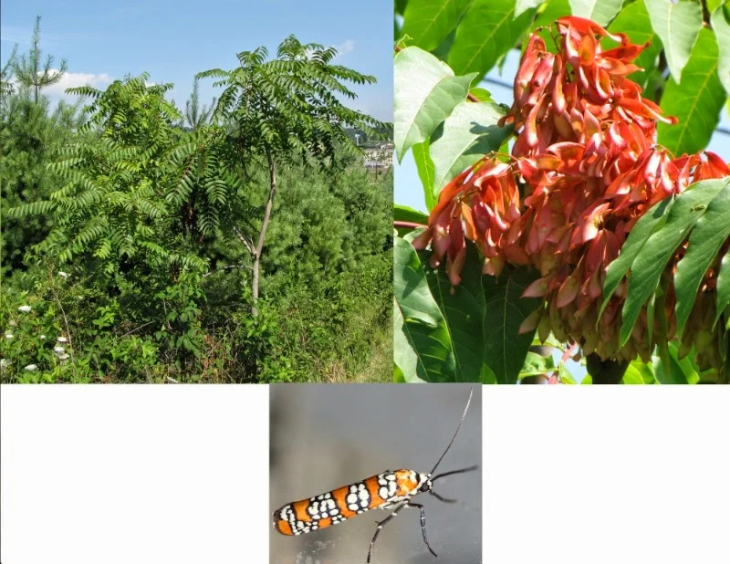 In my neck of the woods, Ailanthus is an invasive alien that looks like a native, but isn't. One of the reasons that homeowners like it is the flowers. Moth enthusiasts know about it because Atteva aurea, the Ailanthus webworm, uses it as its host plant. Here's the photographic evidence.