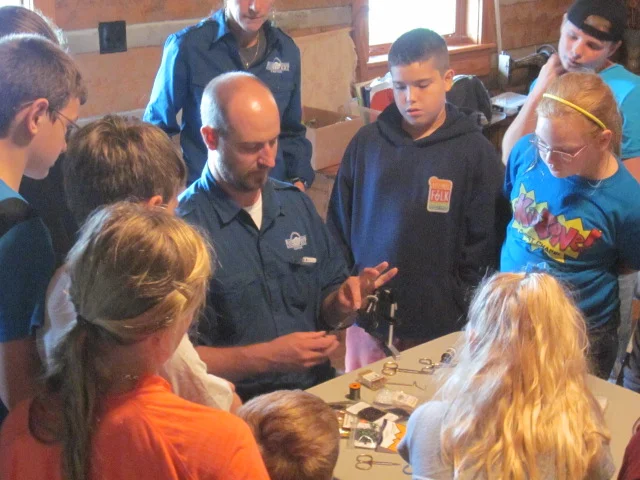Tuesday the weather sent us indoors. Matthew State Forest was generous enough to allow us to use their cabin, so we utilized this space to learn about the various flies used in fly fishing. Using vices, chenille, hackle feathers, hooks and thread, the students made woolly buggers, a fly that imitates many things and can be used in multiple scenarios. Everyone seemed to enjoy this great rainy day activity.