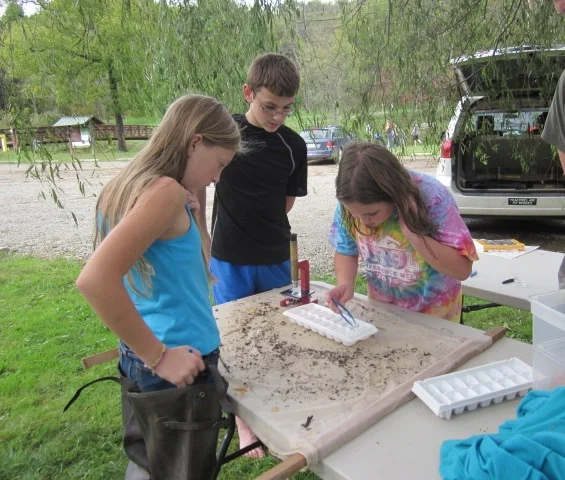Wednesday brought no rain, so we separated into three groups and rotated between three activities at Dannelley Park. Scott Jackson-Ricketts led the fish bugs activity. Waders were put on and the students clambered into the creek to see what they could dredge up. A seine net is placed downstream across the creek and hand rakes, as well as hands, were used to stir the bottom to uncover the macro-invertebrates living below the surface. We removed the net and carried it to a table collecting the aquatic insects in ice trays filled with water. They identified the aquatic insects using a dichotomous key field guide. As with the water quality testing done on Monday, this is an exercise in determining stream health. Brenda Bonk lead the second activity in which the students learned the life cycles of the macro-invertebrates most commonly found; mayflies, stoneflies and caddisflies. They had relay races requiring them to match all three aquatic insects' life cycles and the flies that imitate them. And finally, Lisa Benish had the third group learning the parts of the fly rod, fly reel and fly line. The rod and reels were put together and basic casting technique was taught in preparation for fishing days.
