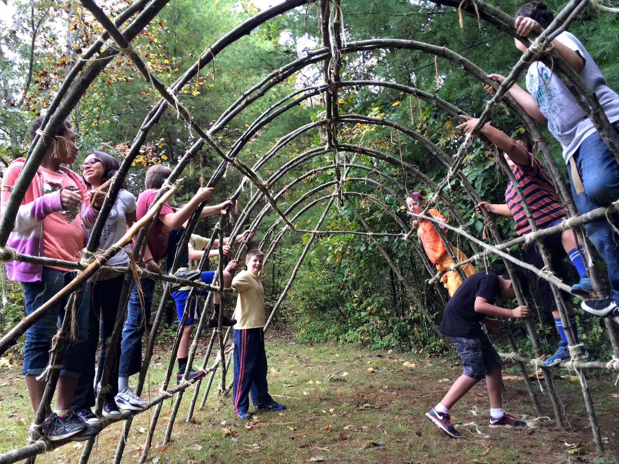 Galax Middle School Students spent the week at Matthews State Forest learning primitive technology as part of their intercession enrichment. A primary goal due to the on-slaught of rain, was shelter! Students spent two days cutting, lashing and erecting a longhouse that was used as shelter from the elements. Patrick Shell, Aaron Floyd, Scott Jackson-Ricketts and Lisa Benish assisted thirteen boys and girls build this structure strong enough to climb upon and keep them all out of the rain. They learned lashing techniques and structural principles.