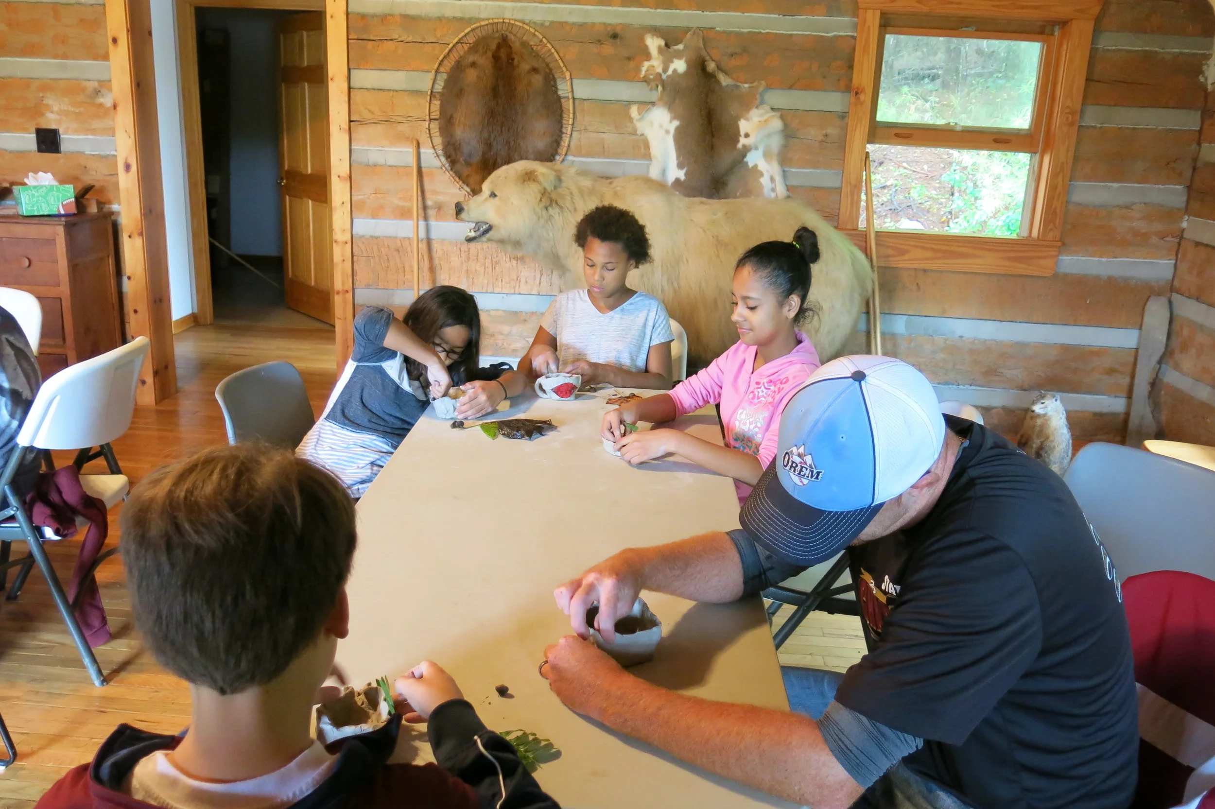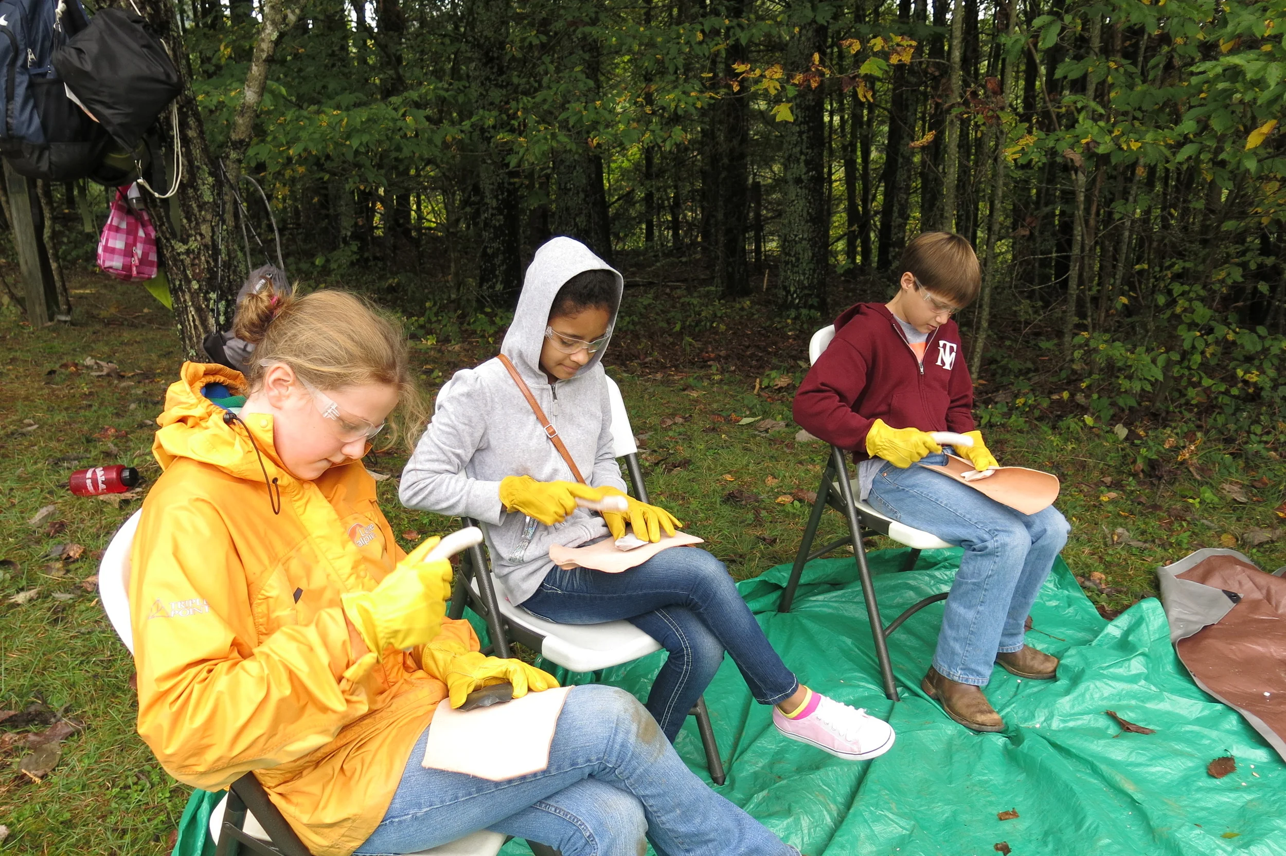 Tools were another necessity throughout the entire week. Aaron Floyd brought his collection of arrowheads and primitive artifacts to share with the students. A short geology lesson and types of local materials that would have been used were discussed and shared. The fun began as Aaron demonstrated flintknapping, a primitive method for making stone tools. All students donned safety glasses and leather gloves ready for making arrowheads. Leather across the thighs readied the students for the flakes that were removed by the billet, an antler that is used to strike the chert or flint to remove flakes for thinning the stone. The pointed end of the antler, the pressure flaker, is used to remove small flakes and shape the tool. Everyone attempted to leave with a tool. It was discovered that tool making is not such an easy feat.