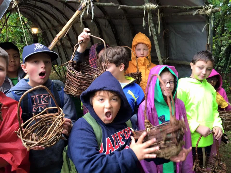 Another type of vessel made by the students were baskets. They gathered vines from the forest that were of an appropriate thickness and yet still flexible enough to bend without breaking. Oriental bittersweet and virginia creeper were excellent sources of material. Also collected was inner bark from green maple saplings used to make the longhouse. This became the lashing material for the base structure of the baskets due to its strength. Students connected the rib structure using the inner bark and then commenced weaving the virginia creeper vine and smaller oriental bittersweet around the ribs to form their baskets. Handles were attached using more of the inner bark lashings. The end results were quite impressive!
