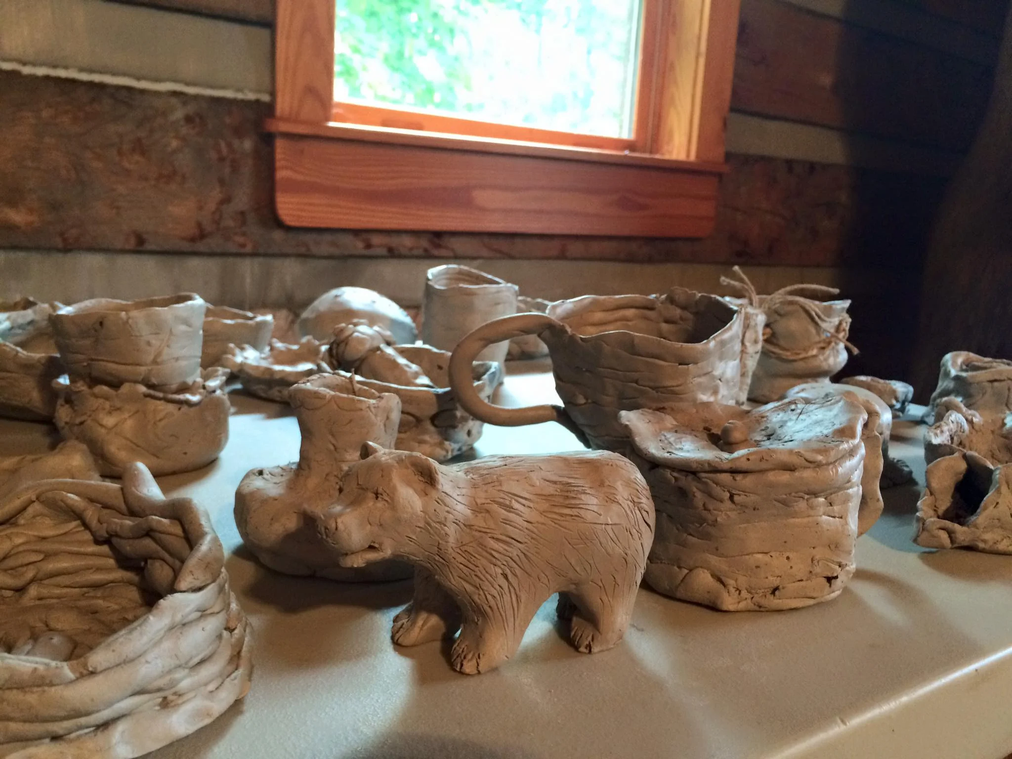 Additionally, they learned about other essential things needed for survival using materials found in their surroundings. Clay, donated by Hoffman Pottery, was used to build vessels that could hold food and/or water. Students were given small slabs of clay and using different techniques, made small pots or bowls. They made pinch pots and coil pots. Pinch pots can be formed and shaped by hand using a methodical pinching process in which the clay walls are thinned by pinching them with thumb and forefinger. Using the coiling technique, it is possible to build a thicker and/or taller vessel. To do this you take the clay and roll it into a long roll. It is then built up by placing one coil on top of the other. Leaves, bark and acorns were collected and used to make impressions in the clay for decorative purposes. There were lots of unique creations made by the students.