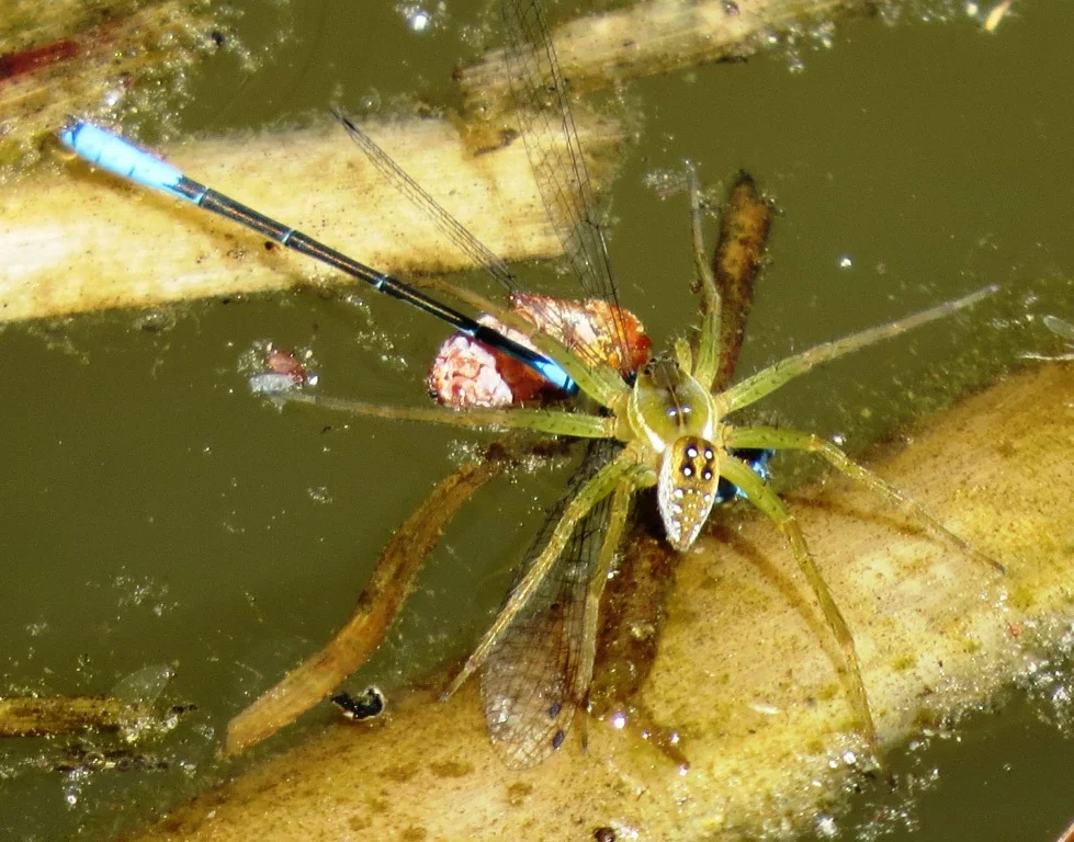 I especially enjoy watching some of my ponds which are fishless and thus have a number of insect and amphibian species that cannot survive around fish. The amber winged spreadwing damselfly is one such species and it thrives only in one of our larger ponds from which fish have been excluded. The males and females pair up and form into the wheel position during which the male grasps the female by her neck and she reaches forward with her abdomen and receives sperm from the accessory genitalia of the male. It is remarkable how complex this and other reproductive processes are in such primitive insects. Life for aquatic insects is not without risk despite the absence of fish, as shown by this photo of a fishing spider which has captured an azure bluet damselfly adult. These ponds also contain amphibian predators as adult frogs; the anuran larvae are herbivorous and tadpoles from last year are now metamorphosing. I show a photo of a green frog that is beginning to reabsorb its larval tail and transition from aquatic to aerial respiration.