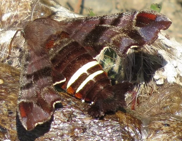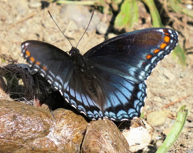 During one of my frequent bike trips on the New River Trail I observed the attraction of a red spotted purple butterfly and a Nessus sphinx moth to carnivorous mammalian feces. Such "puddling" behavior is due to the need of herbivores for sodium salts. So what seems disgusting to us is simply filling of a nutritional requirement. The red spotted purple's distinctive coloration is believed to be mimicry of the toxic pipevine swallowtail. The sphinx moth is remarkable in its ability to hover like a hummingbird while extending a long proboscis to extract nectar from flowers with long and narrow corolla tubes.