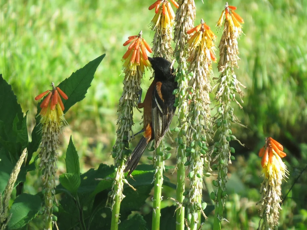 When the red hot pokers we have planted come into flower in June, we can count on seeing our local orchard orioles feeding on the nectar. These orioles have a sharp bill that is suited for drinking nectar from short broad flowers or piercing the base of flowers that are too long or twisted for direct drinking of nectar. They are adept in utilizing flowers of many types, both native and introduced, which is quite useful since they migrate between South/Central America and North America and come in contact with many different species of flowers.