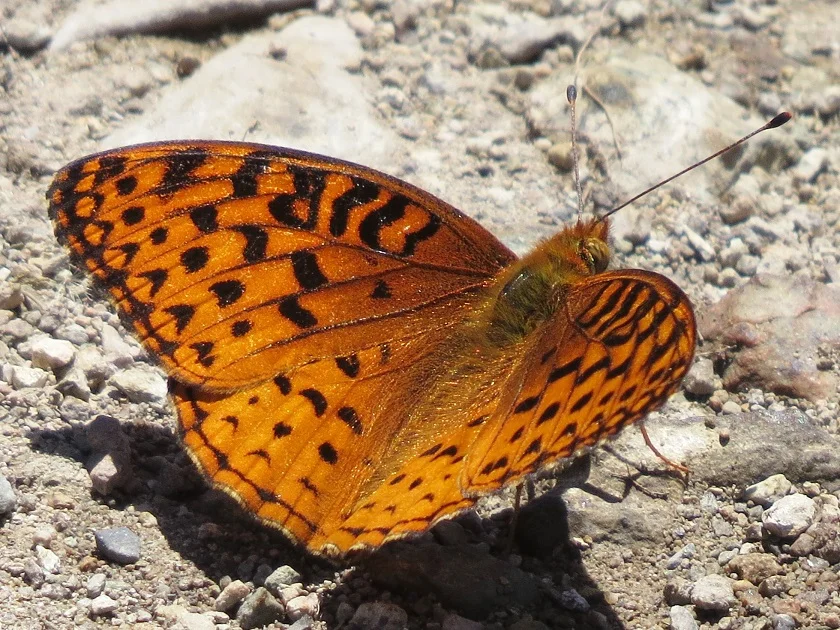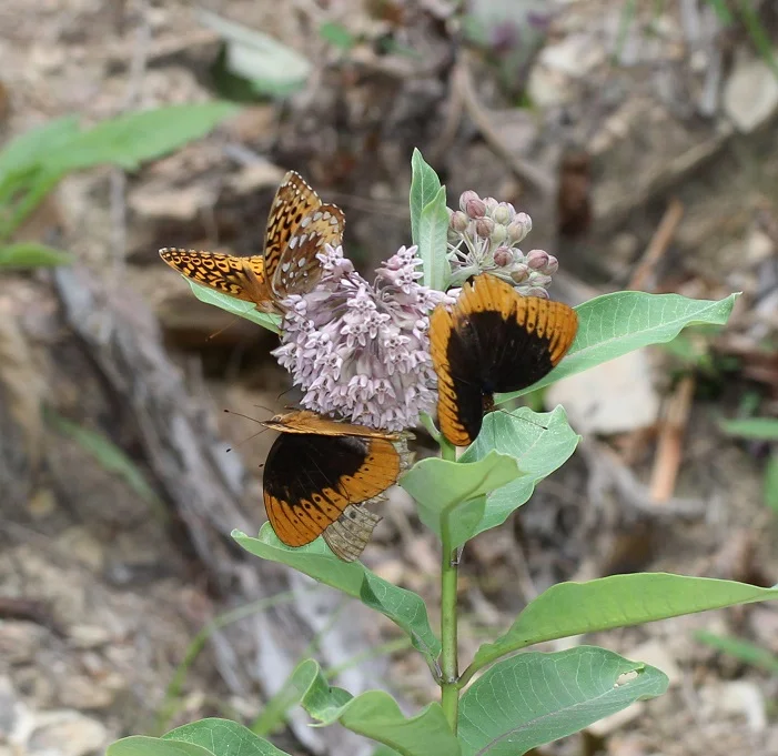 There are three beautiful species of large fritillary butterflies in this area. The Aphrodite from higher altitudes is only slightly different from the more common great spangled, which has a broader white band on the margins of the outer hindwing, and one less spot on the inside margin of the forewing. A third member of the genus Speyeria , the Diana fritillary, is rare in our area but a friend, Cecelia Mathis, has obtained a wonderful photo of two male Dianas with a great spangled on the flowers of a common milkweed along a remote forest road. In contrast with most sexual differences in which the male is more showy, the male Dianas are a relatively dull brown and orange color compared with the brighter black and blue female. The color of the female is even more remarkable since it appears to be a case of mimicry of the toxic pipevine swallowtail.