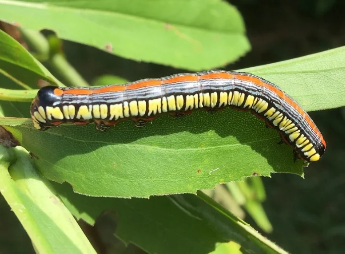 In late July on our VA farm, the predominant color of the landscape is GREEN! But our 10 year old pollinator field is now predominantly yellow with the blooms of oxeye sunflower. This is a table set for the multitude of mouths of the lepidopterans (butterflies and moths), which are a prime food for birds. While some of these insects may be considered pests, many are spectacularly colored and have very interesting habits for study by the naturalist.