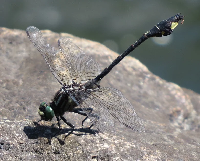 Within a mile of our farm there is the New River, which is said to be the second oldest river in the world (after the Nile). It has different aquatic fauna than our small spring fed streams and ponds and I often go there to see new species. This cobra clubtail dragonfly is a fierce predator on small insects; on a hot summer day it was "obelisking" or holding its abdomen in a vertical position to minimize heat gain from the sun. Nearby there was a damselfly that I never see on our ponds, a ruby spot damselfly. The male is much more brilliant than the female and is quite a spectacular fellow. Both of these species are characteristic of larger streams and rivers, presumably due to some specific but generally unknown requirements for the larvae and/or adults.