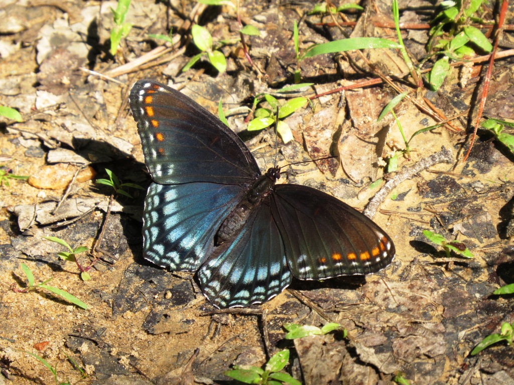 We have planted cup plants (Silphium) which have large yellow blossoms in mid-summer attractive to butterflies. Here a pipevine swallowtail is finding nectar in the flowers while being protected from the attacks of birds by its black and blue coloration which advertises toxicity obtained as a caterpillar from its food plant (Aristolochia species). There are many other butterflies that mimic this coloration in an apparent bid to inhibit birds from attacking them. One of the most beautiful is this red spotted purple, a type of brushfoot butterfly (kin to admirals and buckeyes).