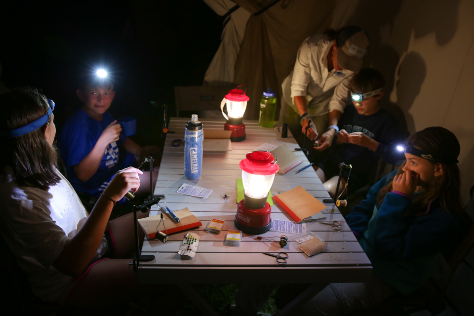 To cool off from the hot day we leaped into the swimming hole, again and again and again until our stomachs growled for dinner. Upon returning to camp out came the headlamps and bobbins to tie flies for the next day's adventure. They learned a streamer pattern, a never sink dry fly and a giant stonefly.