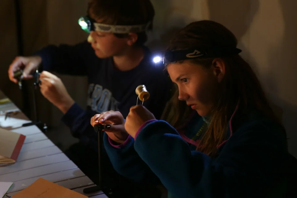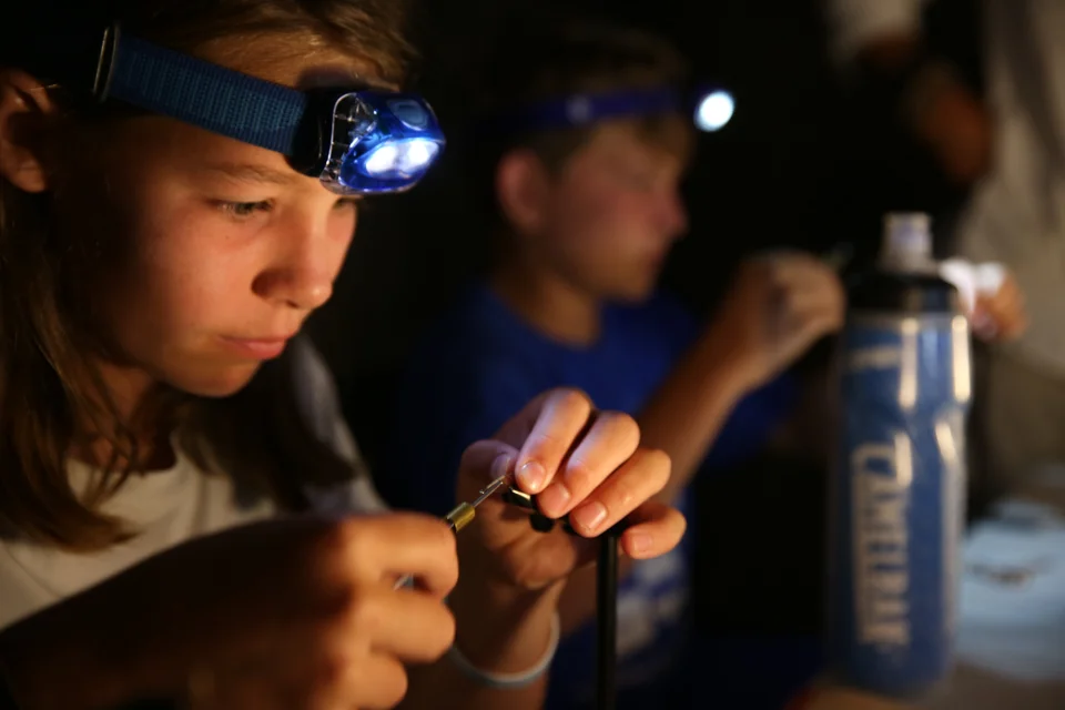 After some field casting lessons and sustenance we headed to the farm ponds for experience on how to set the hook, land and release the fish. As we got on the water heavy bands of rain crossed over us. Although the kids didn't mind one iota, the fish shut down. Once the rain passed the bluegill and largemouth bass returned as hungry as ever. One massive bass in particular was relentless with bluegill that we retrieved. With the fishing biting, we stayed until the light faded away. Only the promise of s'mores took them off the water. After a brief journaling session the camp went silent for the night.
