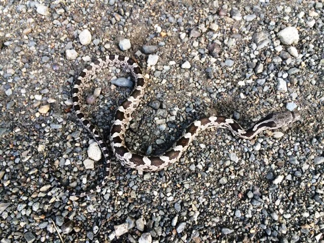 On a recent bike ride along the New River Trail in VA I was more or less in auto-pilot and was paying less attention to my surroundings than I should have. My biking companion Mason suddenly shouted that he had run over a copperhead! I was shocked that I had been so careless to have not noticed the rare snake and also doubted that it was really a copperhead. Humans have a very strained relationship with snakes and often misidentify them. But to my surprise and delight, it was indeed a copperhead. Against the gravel background of the trail the copperhead stood out in stark relief. When I moved it off into the adjacent leaves it blended in magnificently. Aside from a very beautiful camouflage pattern, copperheads have an elliptical pupil and a distinctive pit organ between the eye and nose. This is a most remarkable sensory structure that allows for the snake to detect infrared radiation and to distinguish a tiny difference in temperature between an object and the background. This seemed to be a female snake that was gravid, so I am hoping she did not suffer serious damage from being hit by the bike tire.