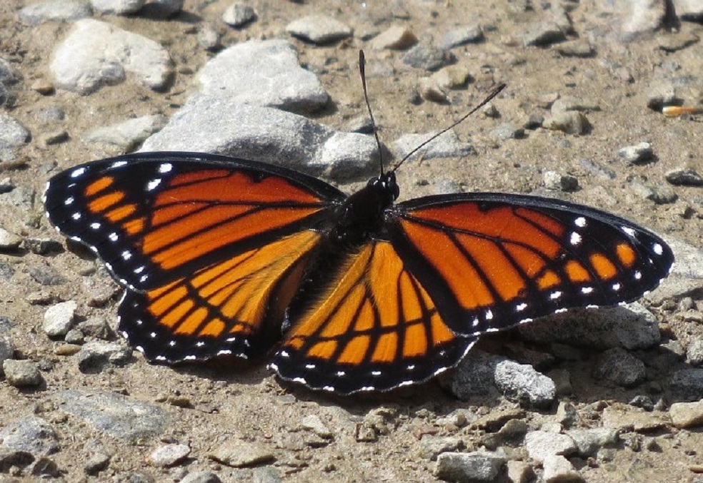 I came across this spectacular viceroy butterfly sunning on a gravel path on a cool day. Two things are interesting about this- the sunning behavior to raise its body temperature, and the fact that it did not fear predation when so exposed. The viceroy is partially protected by the toxins it caterpillar ingested from its larval food of willow. But it also gains protection by its mimicry of the even more toxic monarch butterfly.