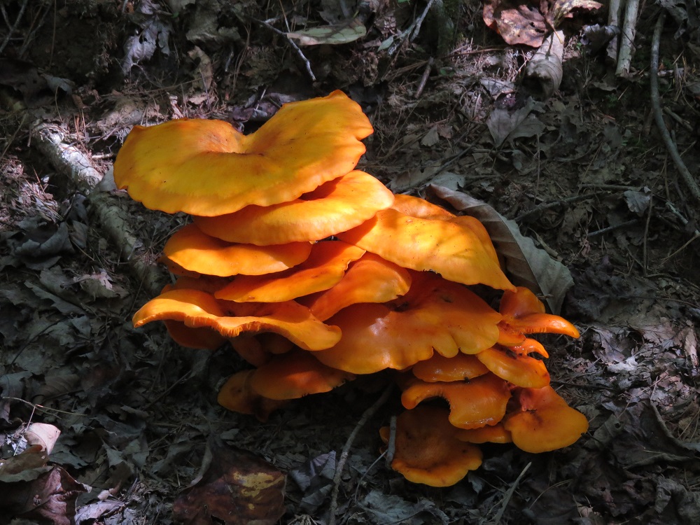 We had a period of very wet weather and one result was a profusion of fungi in the woods. This Jack o-lantern is a spectacular example that not only is colored like a pumpkin but glows at night with bioluminescence. The purpose of such light production is unknown but the resulting "foxfire" is mysterious and impressive on a very dark night. But do not eat these surface fruiting bodies of the underground mycelium, since they are poisonous.