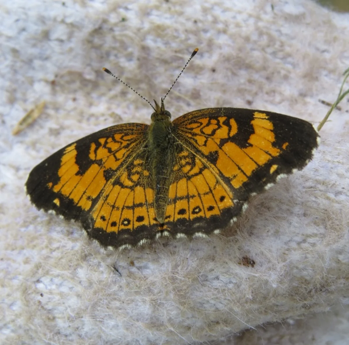 As herbivores, butterflies are often deficient in sodium salts which are more common in animal prey than in plant food. So when I hung out my sweaty socks after a long hot hike, this pearl crescent landed on the sock and started drinking the salty fluid ! Butterflies must detect the odor of such garments since they target them so quickly. This is a variant of puddling behavior in which butterflies drink fluids from feces or salty damp soil.
