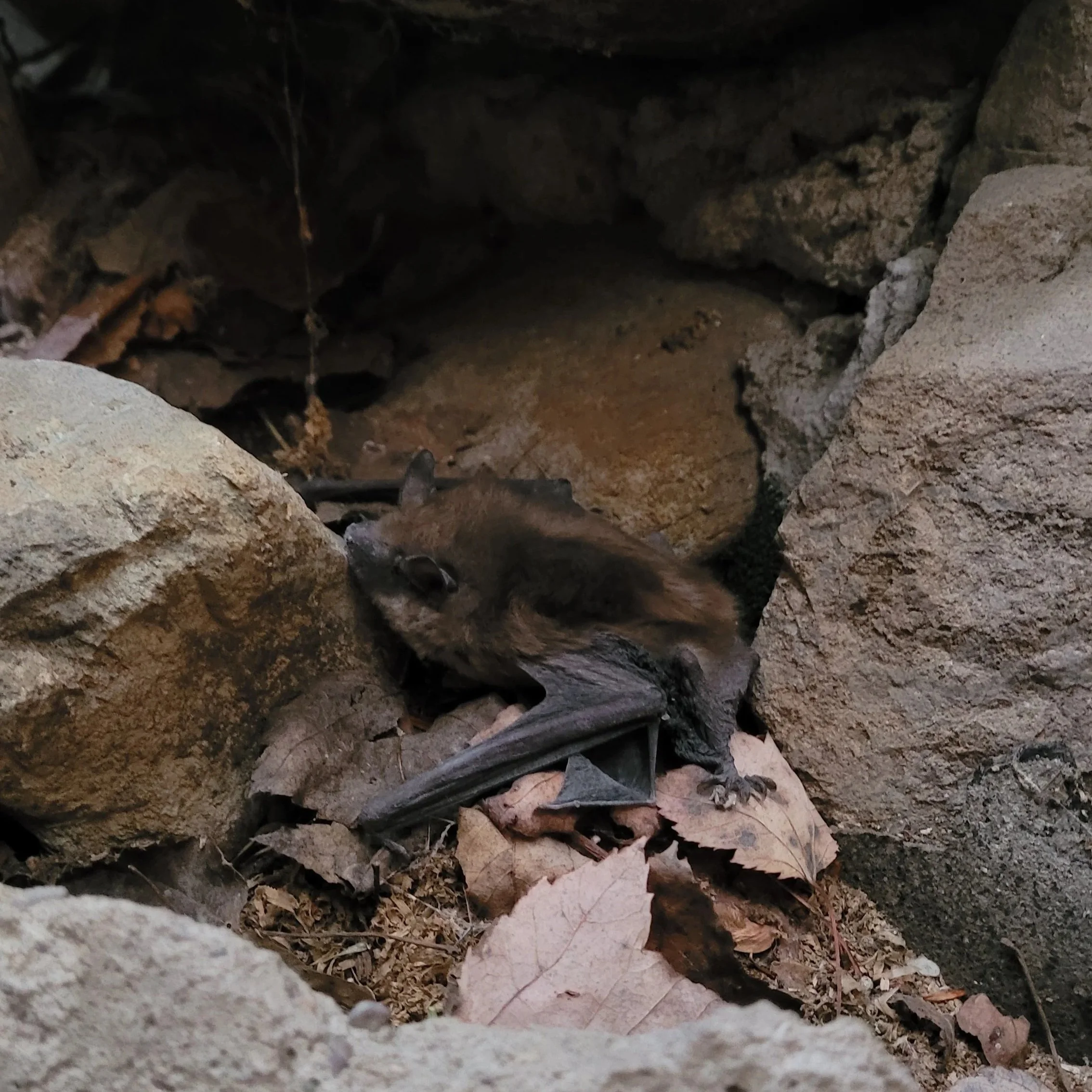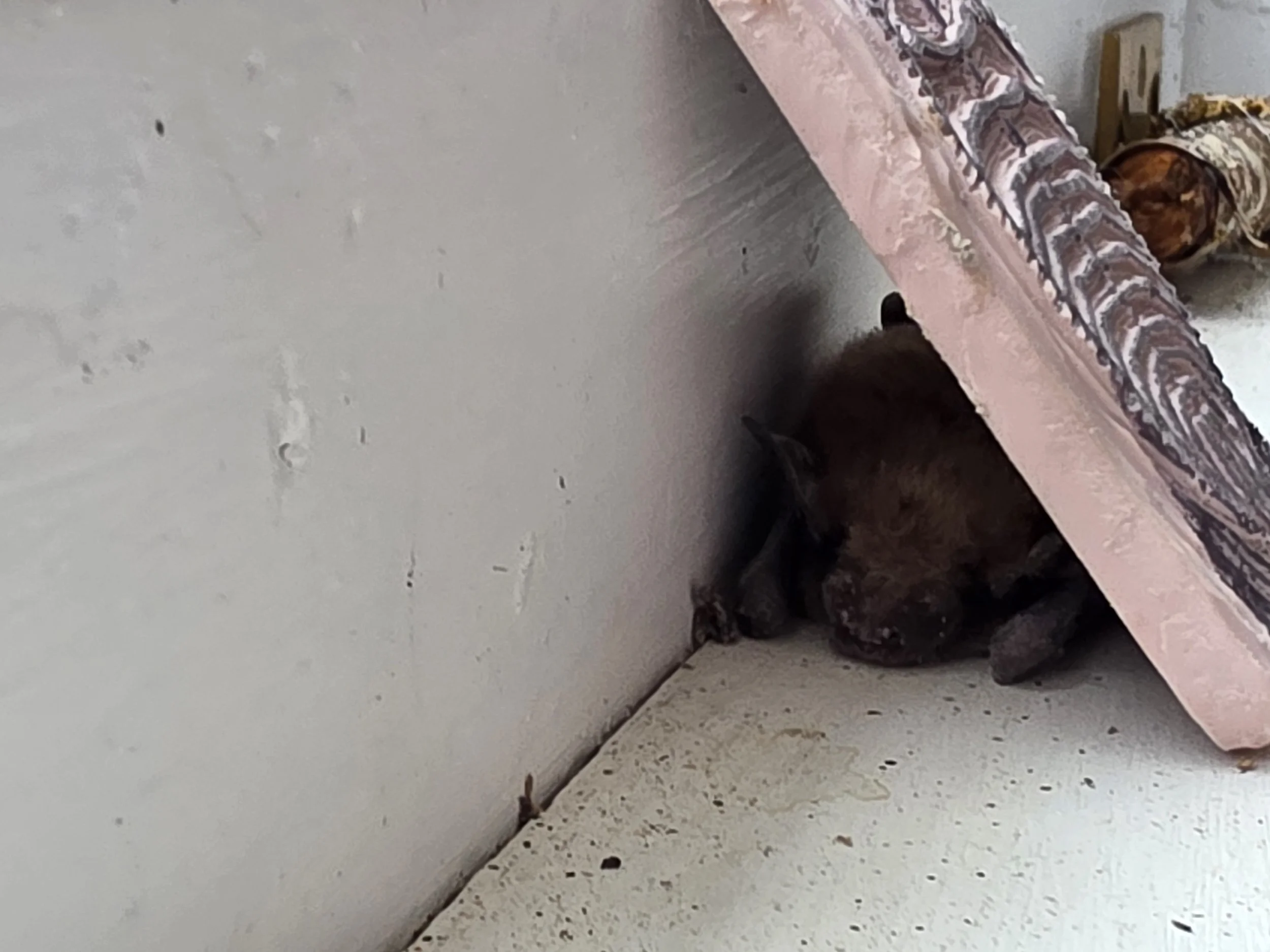 A big brown bat that decided to hibernate in the BRDC basement! We did decide to very carefully transfer this bat to another protected location where he wouldn’t be awakened early and starve.