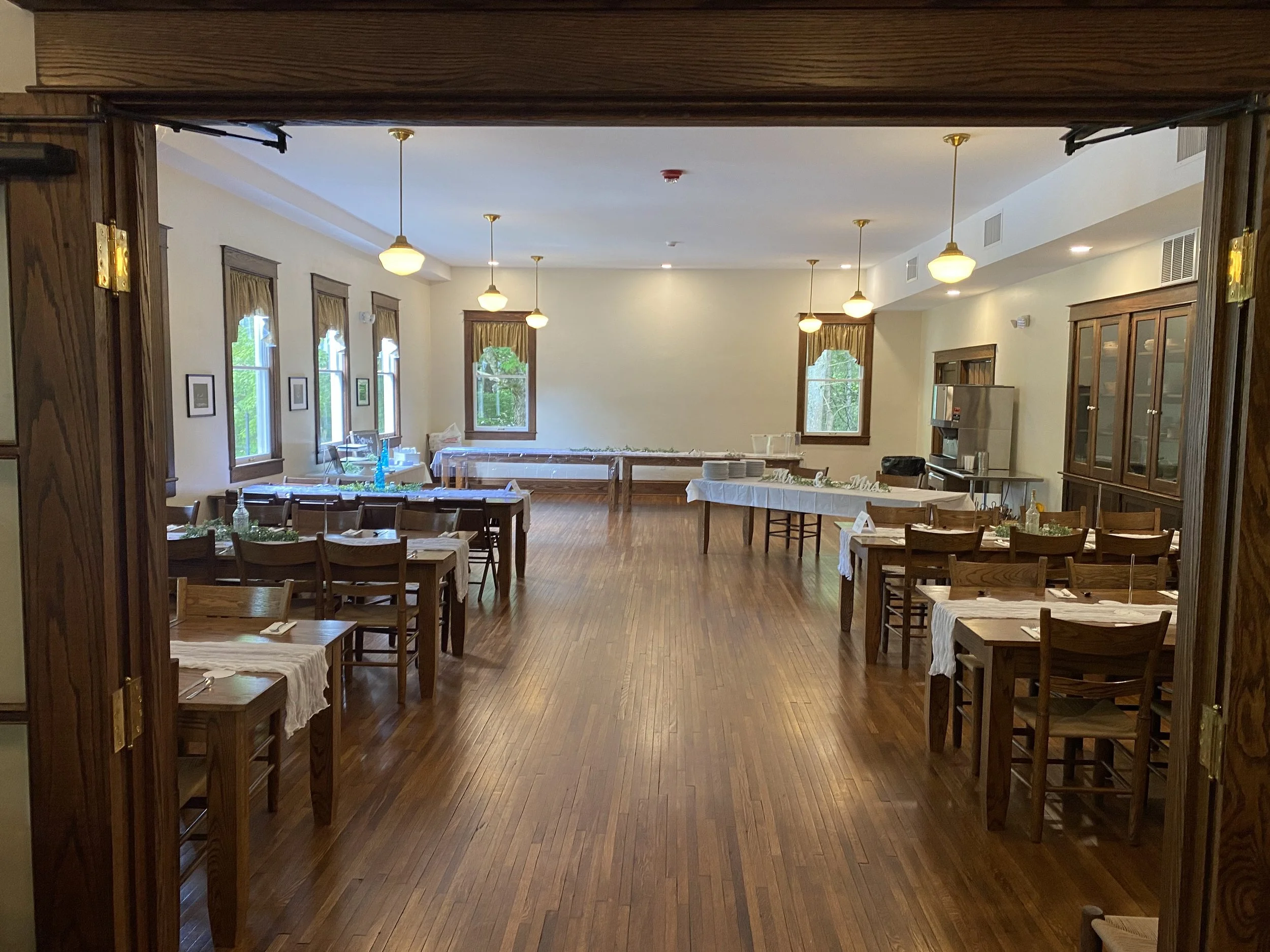 Our commercial kitchen is fully equipped to efficiently serve guests a variety of complex hot meals. Food can be conveniently distributed through a passthrough window or plated directly in the dining hall. Featuring a six-burner range, dual propane ovens, stainless steel prep areas, an ice machine, coffee percolators, pantry, and basement freezers, this kitchen is ready for extended, full-service meal preparation.